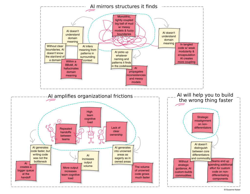 AI helps you build the wrong things faster. AI doesn’t distinguish between core differentiators and commodity. Without strategic guidance, it happily custom-builds solutions for non-differentiating problems that already have commodity or off-the-shelf alternatives. Teams then end up spending review and maintenance effort on custom code of non-differentiating components.