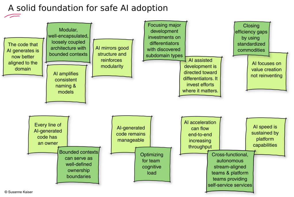 With modular, well-encapsulated bounded contexts, AI infers meaning from patterns that are now semantically coherent. Business logic is grouped together rather than scattered across the system. The hallucination of domain meaning is significantly reduced, and AI-generated code is better aligned to the domain. Consistent naming within bounded contexts means AI amplifies consistency rather than propagating inconsistencies. With loose coupling between bounded contexts, AI mirrors good structure and reinforces modularity instead of creating more coupling.