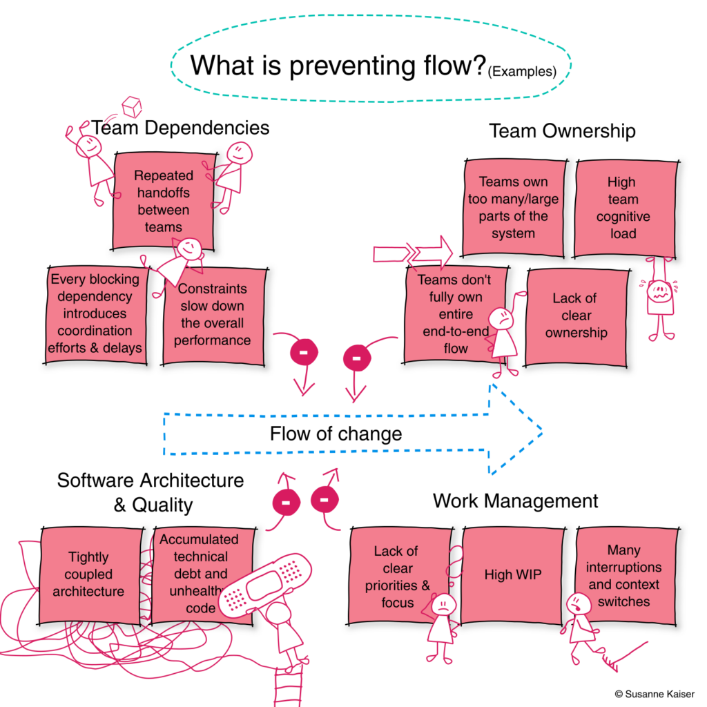 In my experience working with organization across different industries, the blockers tend to cluster around four areas: team ownership, team dependencies, software architecture and quality, and work management.