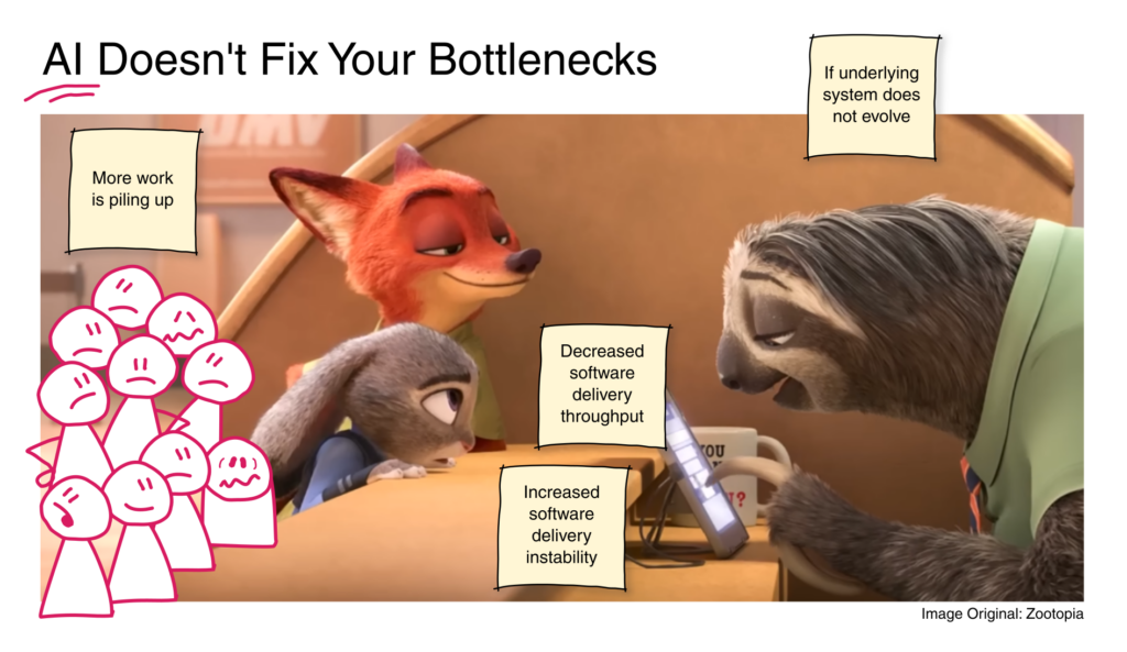 AI doesn’t fix your bottlenecks. It amplifies them. DORA’s report on AI-assisted software development [1] confirmed that AI amplifies existing flow and exposes brittle processes and frictions. If your flow is good, AI makes it better. But if you have a lot of painful bottlenecks and frictions, AI makes the pain worse.